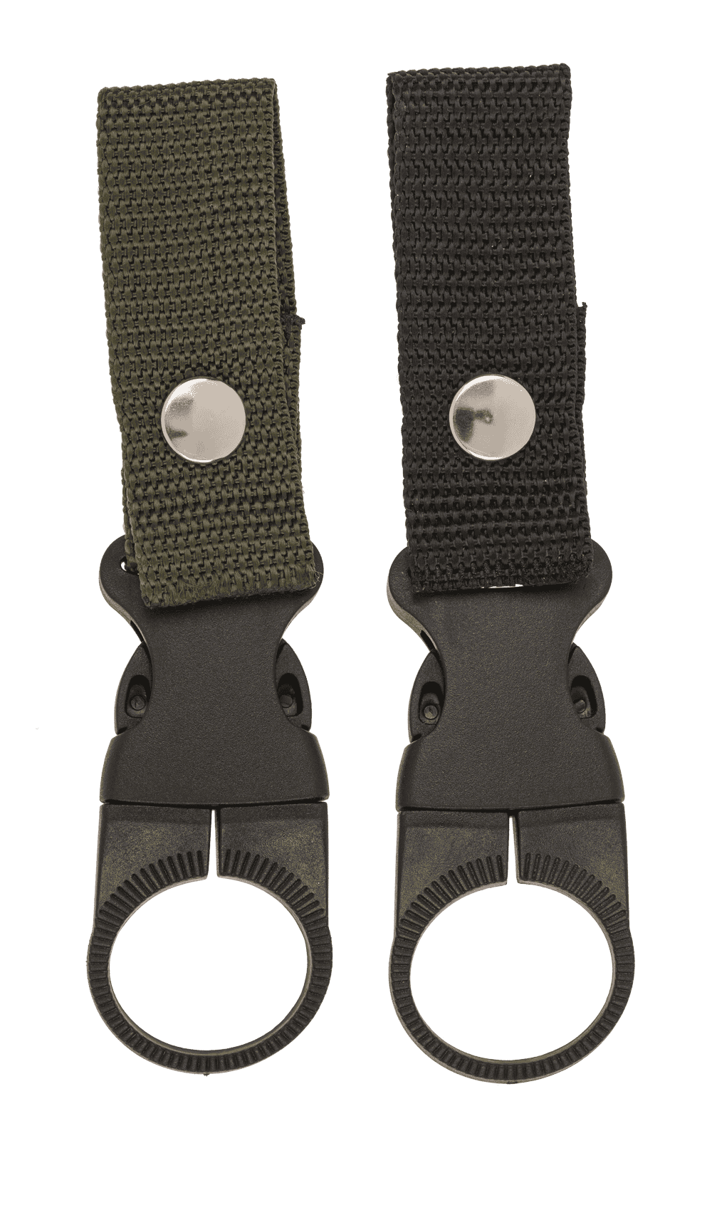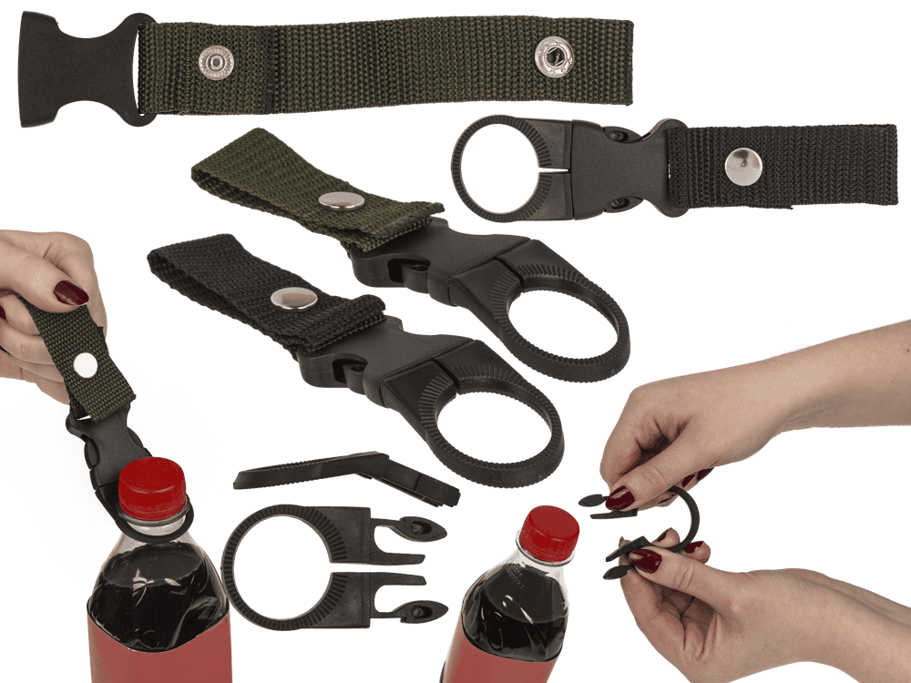 pour sacs à dos, ceintures, sacs à bandoulière, pour toutes les bouteilles PET, assorti en 2 couleurs (20x noir, 10x vert foncé), sur carte header, 30 pièces dans le présentoir