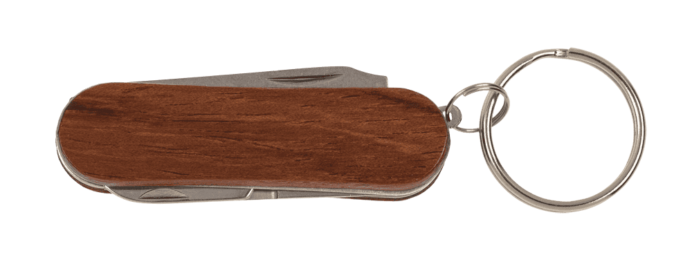 Outer sides = wood, dimensions 6 x 2 x 1 cm when closed, scissors 4 cm, screwdriver/bottle opener, file 4 cm, knife blade 4 cm, 12 pieces in display